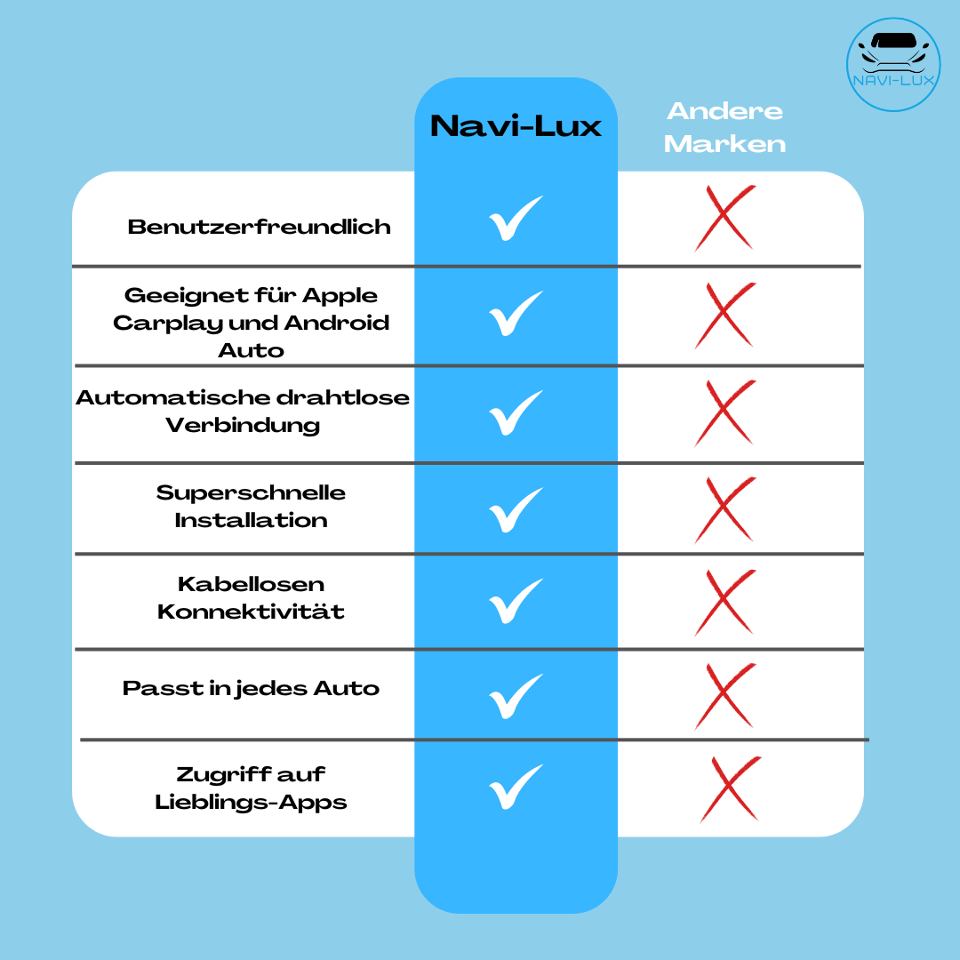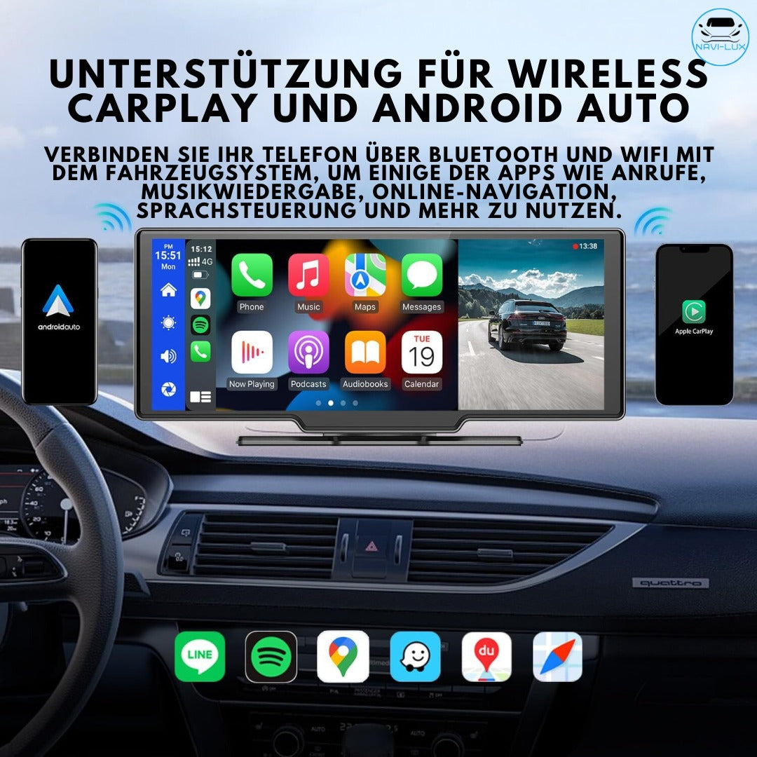 Genießen Sie den Komfort der kabellosen Konnektivität mit iPhone CarPlay & Android Auto. Kein Ärger mit Kabeln, nur müheloser Zugriff auf Ihre Lieblings-Apps und Navigation. Machen Sie Ihre Autofahrt einfacher und kabellos mit Navi-Lux™ 2.0.